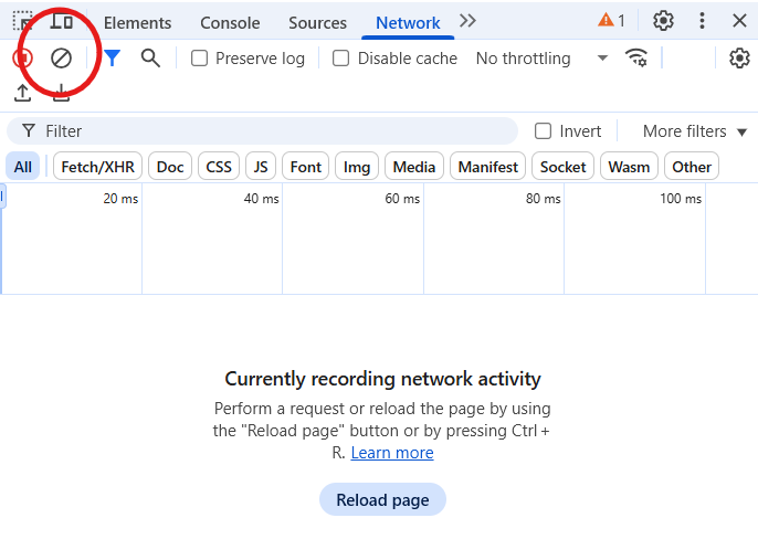 - Klik op het tweede icoontje om de logs te verwijderen (Clear network log)