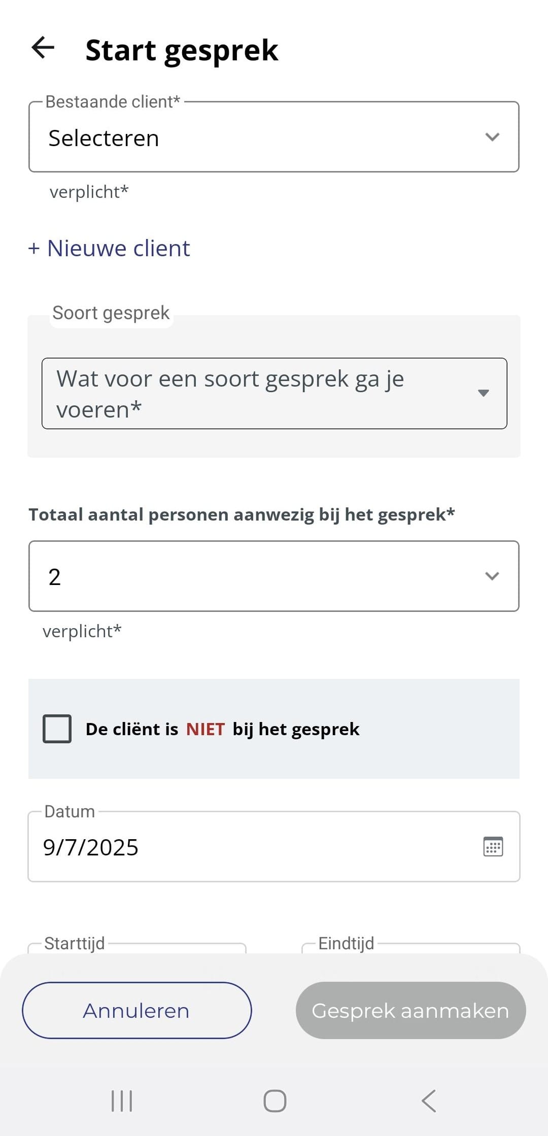 - Voer de gevraagde gegevens in en klik op ‘Gesprek aanmaken’.