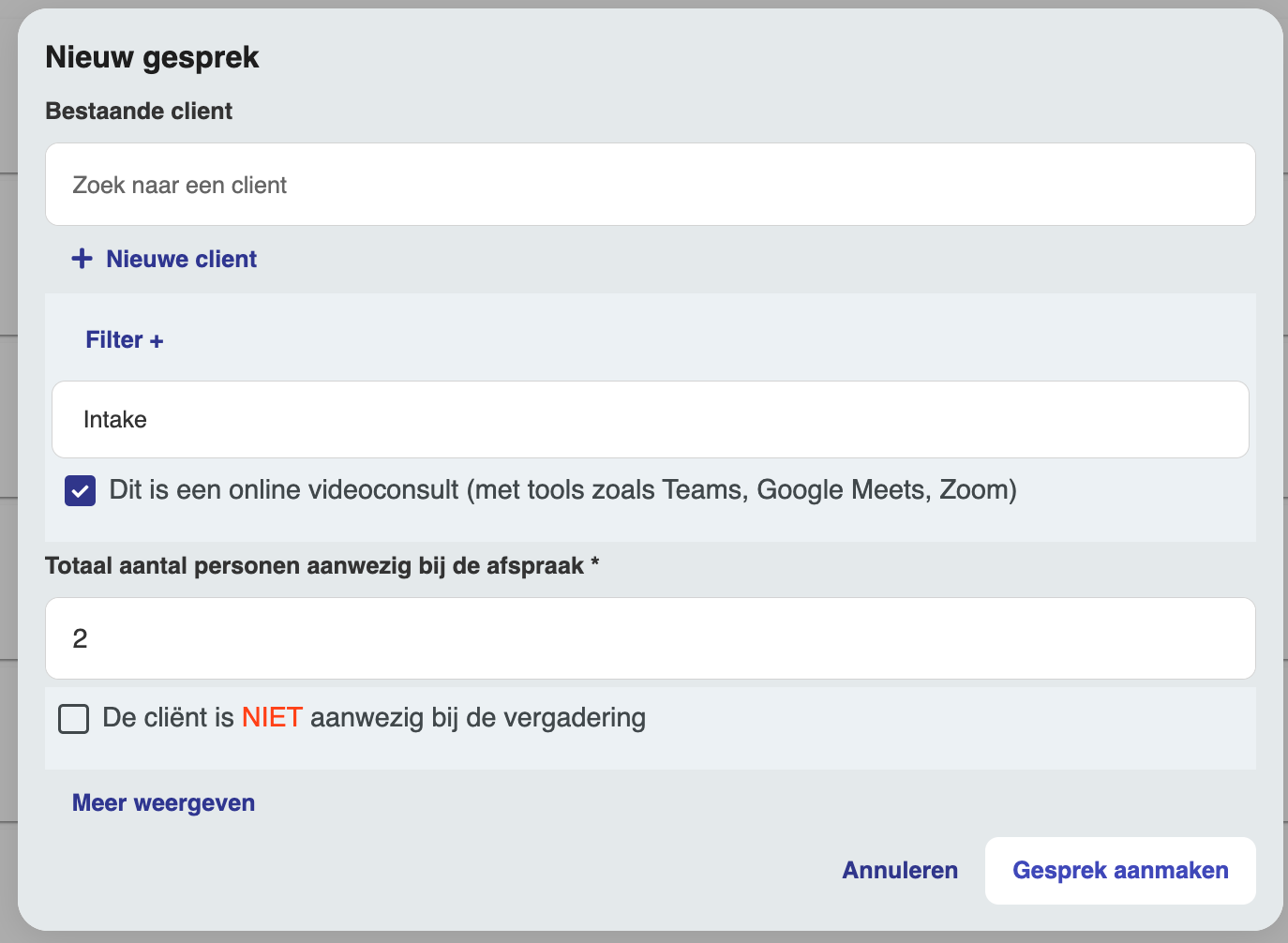 Het starten van een afspraak gaat nu nóg sneller: je vult alle benodigde informatie in dezelfde stap in. Minder klikken, meer tijd voor je gesprek.