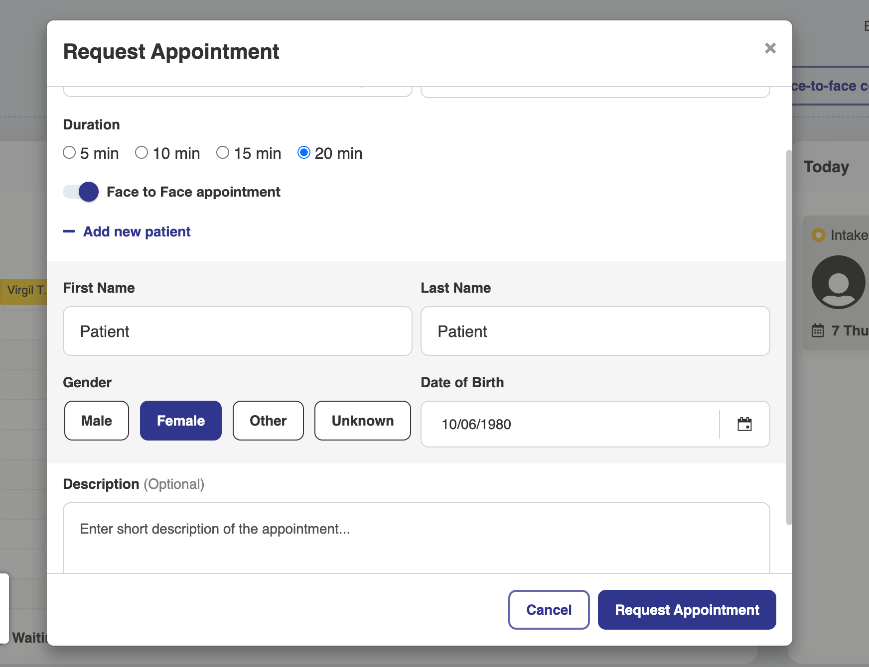 🧑⚕️ Patiënt informatie Sectie: Start een consult of gesprek door nieuwe patiënten toe te voegen of te kiezen uit bestaande profielen voor een soepele setup.