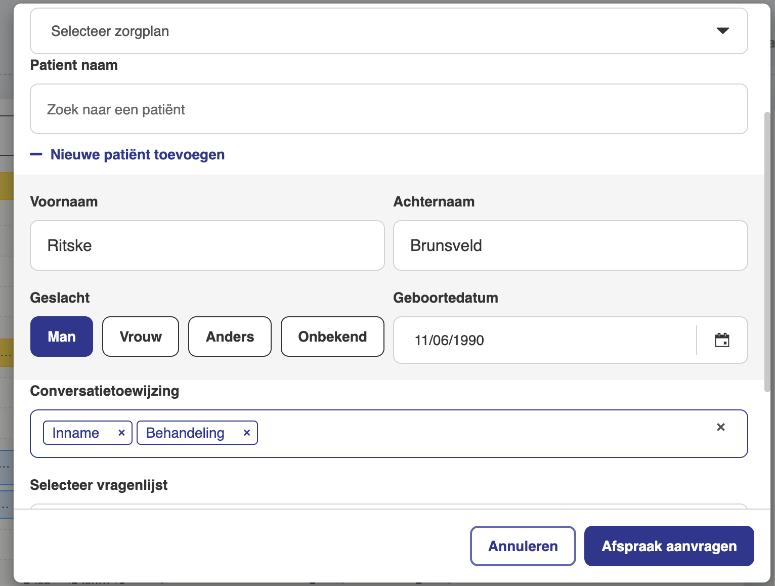 - Je kunt nu snel en eenvoudig een patiënt handmatig toevoegen of zoeken in je bestaande patiënten: